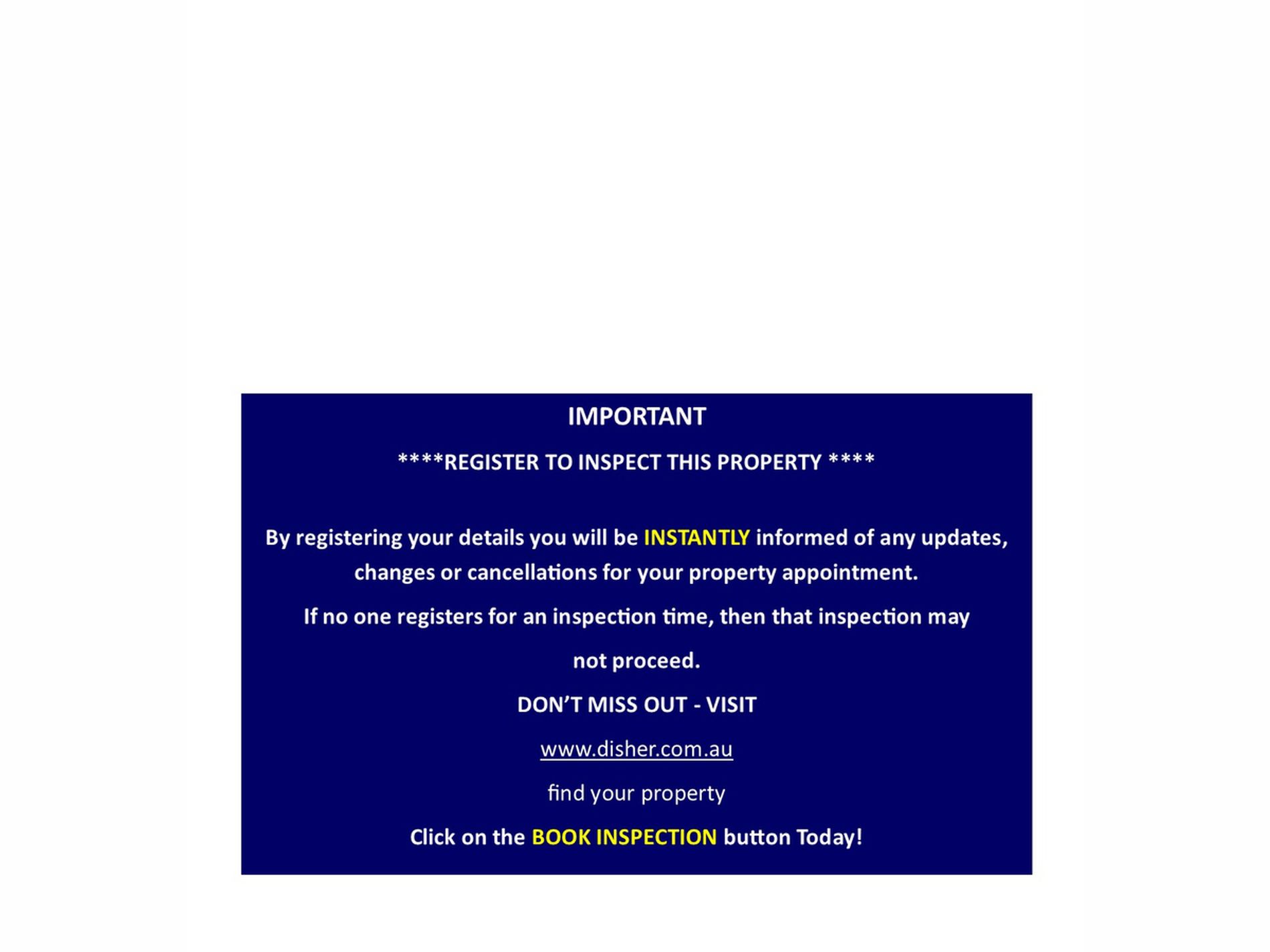 Register online and you will be immediately informed of any updates, changes, or cancellations to your appointment, or call Doug Disher Real Estate 3870 1234 to arrange an inspection time for you. If there are no registrations, the inspection may not take place.
