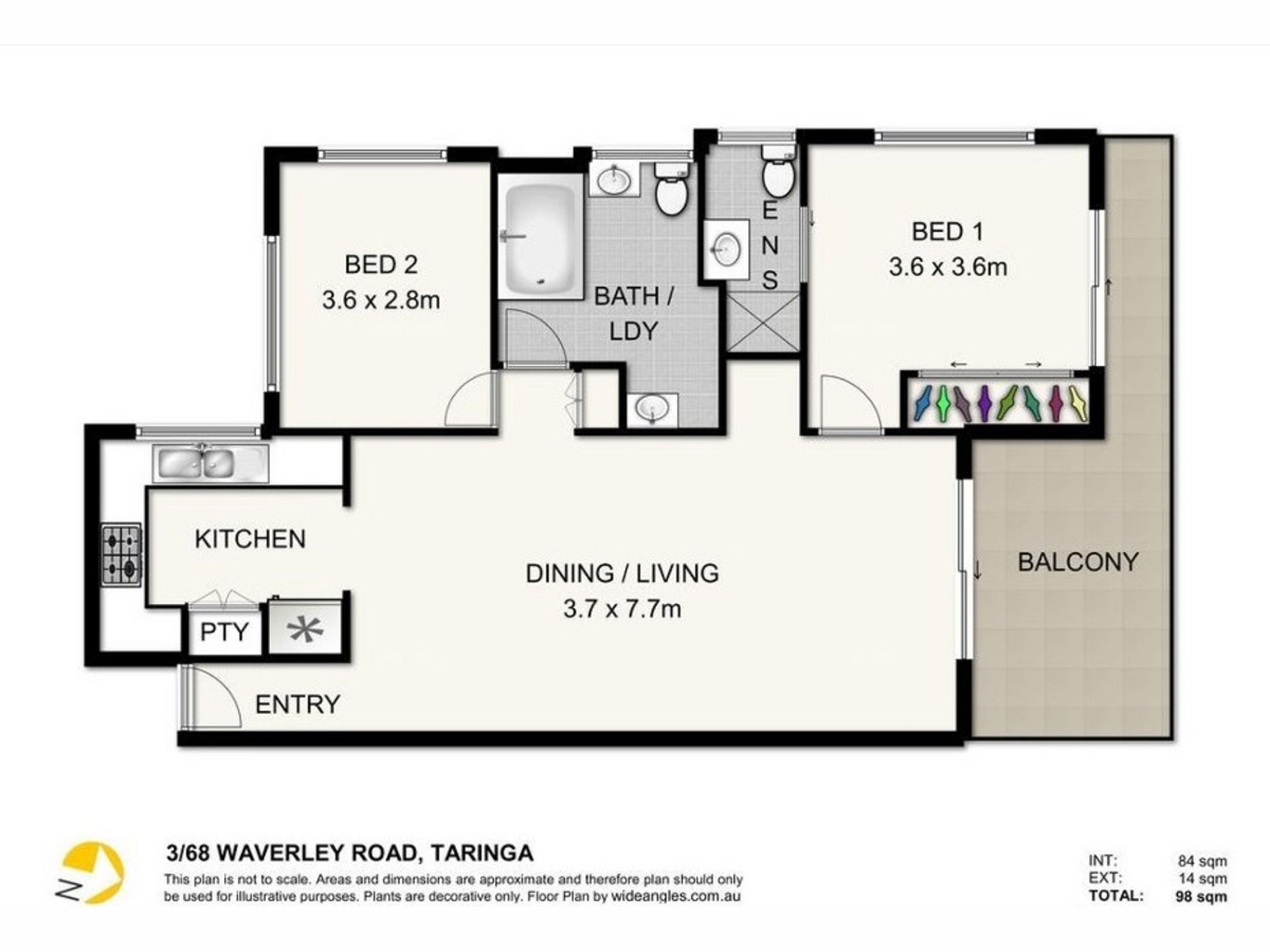 Both bedrooms have built-in wardrobes. The living room and master bedroom are air-conditioned, while the master bedroom has an en-suite and separate access to the balcony with security screens.