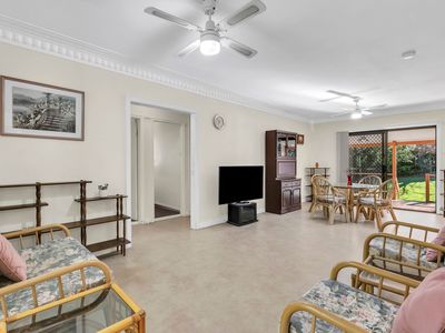 The generously sized living area is air-conditioned. The kitchen has a sizable island bench, plenty of cupboards and drawers, electric cooking and dishwasher. This is also where the European laundry is housed. There is a sunken dining, or multipurpose area, connecting the kitchen to the back patio.