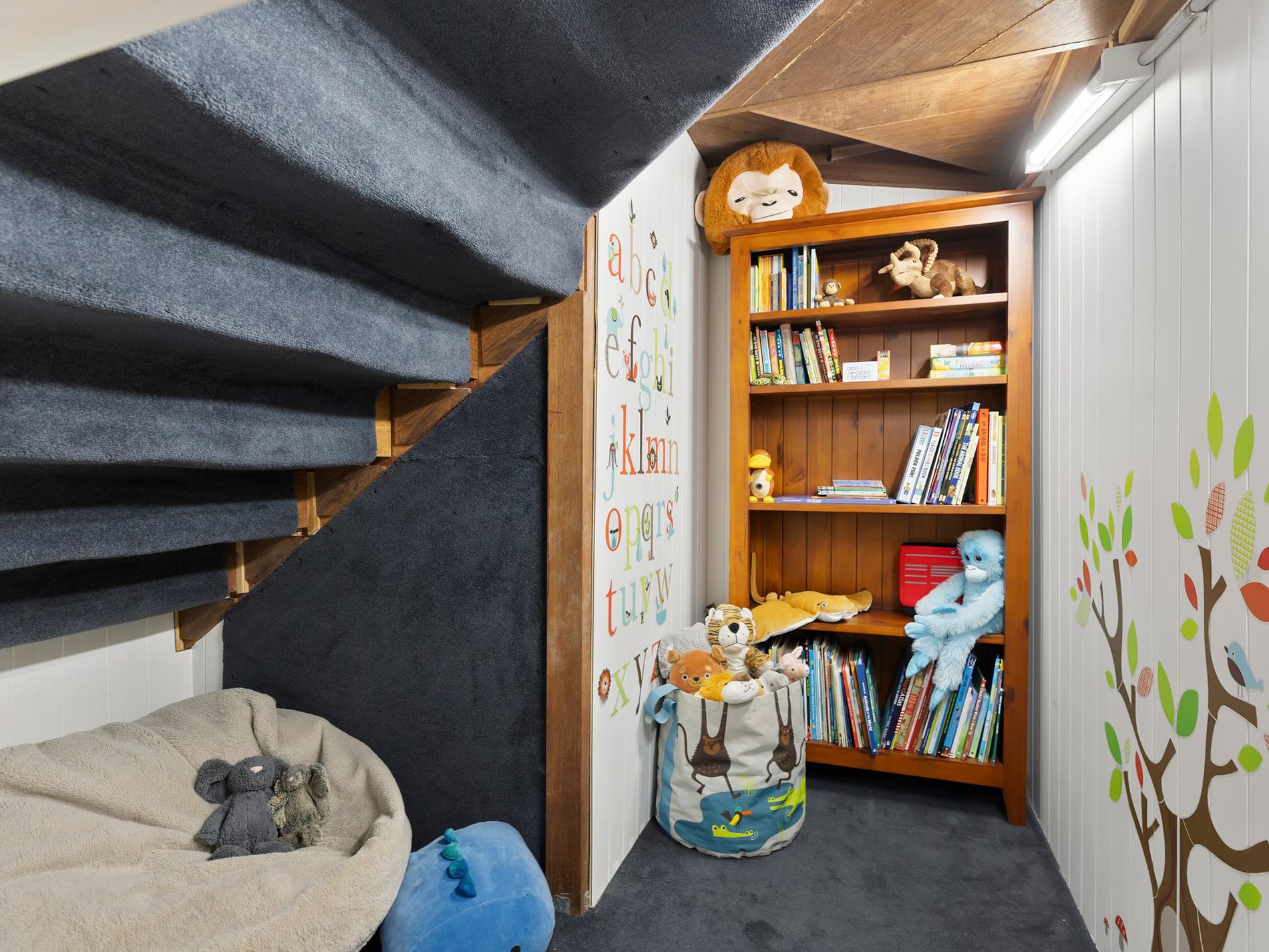 On the lower level, you'll enjoy air-conditioning in every room, 2.7m-high ceilings, polished concrete flooring, a spacious and light-filled family room and a brilliant home office, lined by casement windows, with clever and functional finishes that will make working from home an absolute pleasure. It also hosts the master bedroom, with over 5m of built-in wardrobes, and a stunning 'His and Hers' ensuite. The final bedroom is sure to be a favourite, with its secret reading cubby built in underneath the stairs. It's a delightful space where your children can relax, nourish their minds and just be kids.